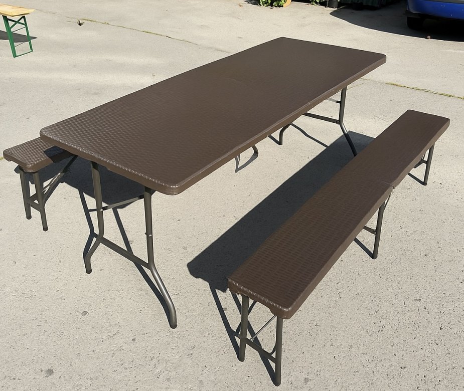 Rozkládací Kempový stůl 180cm s lavičkami s dřevěným vzorem, pokud se chystáte ven do kempu, nebo jen tak plánujete zahradní oslavu, určitě by Vám neměl chybět tento skvělý rozkládací stolek.