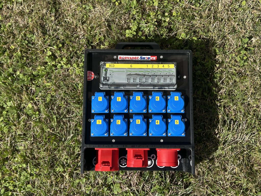 Výstup: 10× 230 V/16 A + 5× jistič 16 A D 1P, 1× CEE 32 A 400 V 5P – průchozí, 1× CEE 16 A 400 V 5P + 1× jistič 16 A D 3P, 1× RCD 40 A 4P 30 mA, 3× kontr. fáze L1, L2, L3