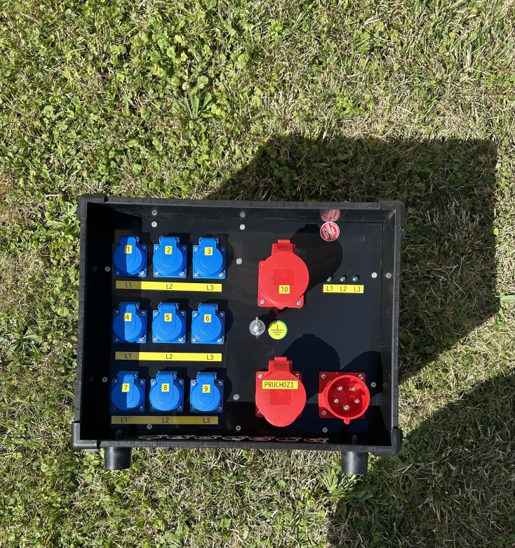 Mobilní rozvaděč řady „MPB“. Modulová okna v provedení 12,4 TE, kovová integrovaná madla „obalena“ gumou. Vstup: přívodka 32 A 400 V 5P Výstup: 9× 230 V/16 A + 9× jistič 16 A C 1P, 1× CEE 32 A 400 V 5P + 1× jistič 32 A C 3P, 1× CEE 32 A 400 V 5P – průchozí, 1× RCD 40 A 4P 30 mA, kontr. fáze L1, L2, L3 Rozměry: šířka: 450,00 mm, výška: 280,00 mm, hloubka: 350,00 mm