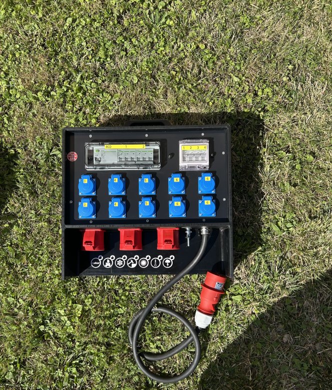 Mobilní rozvaděč řady „HPB“, modulové okno v provedení 12 TE, plastové madlo. Rozvaděče s přívodním kabelem osazeny kovovou vývodkou proti vytržení kabelu. Vstup: Kabel H07RN-F 5G6 1 m + vidlice CEE 32 A 400 V 5P Výstup: 10× 230 V/16 A + 4× jistič 16 A B 1P (UNIBIS), CEE 32 A 400 V 5P + 2× jistič 32 A D 3P, 1× CEE 32 A 400 V 5P – průchozí, kontrolka fáze L1, L2, L3 Rozměry: Šířka: 290,00 mm, výška: 360,00 mm, hloubka: 93,00 mm