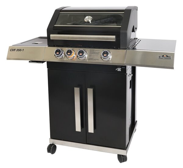 Kingstone Plynový gril Cliff 350-1 3 hořáky; grilovací plocha: 59 × 45 cm; 13,5 kW LPG láhev a těsnění nejsou součástí výpůjčky Disponuje třemi kvalitními nerezovými hořáky Piezo zapalování umožňuje bezpečné podpalování Disponuje integrovanou BEAST ZONE pro lepší chuť Ovladače s LED osvětlením zpříjemňují grilování za tmy Rošt pro udržení tepla je součástí