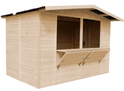 Dřevěný prodejní stánek Timbela M150A, 6 m2, se 3 pulty představuje vysoce kvalitní prodejní prostor pro vaše akce. Materiály jsou vyráběny a zpracovány v Evropě a použité dřevo je certifikováno. Stánek, který se snadno skládá a rozkládá, tvoří 17mm skořepinová konstrukce obložení stěny a certifikovaná EU borovicové a smrkové dřevo. Uzamykatelné okno slouží současně jako pult, prodejní a servisní plocha, zatímco uzamykatelné dveře lze připevnit na požadované místo. Podlahové desky jsou silné 18 mm, střecha z bitumenové vlnité lepenky zajišťuje stabilní konstrukci. S dřevěným prodejním stánkem Timbela M150A, 6 m2, se 3 pulty uděláte dobrý dojem na každém trhu, veletrhu a festivalu.